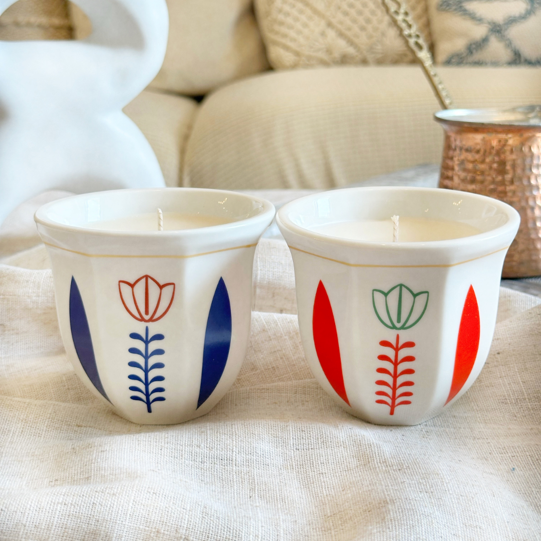 مجموعة من شمعتين مصنوعتين يدويًا مستوحاة من التقاليد، كل واحدة منها ذات لون فريد من نوعه ومليئة بالروائح الحنينية.